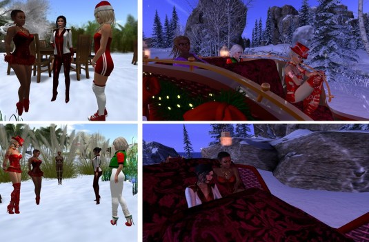 December 19th: slave Flo, Mistress Jenny, Angelique (upper left) / slave Gwendi, slave Flo, Dana, Mistress Jenny, Diomita (lower left) at home / slave Gwendi, Dana, Diomita – Mistress Jenny, slave Flo at A Calas Christmas doing the sleigh tour
