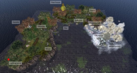 Kindred Spirit consists of 2 islands and a white fantasy world a bit offshore. The landing is at the end of one of the two islands and you can follow a path from there over the 2 islands to the white fantasy world. You should look left and right of the path to see all the hidden spots to enjoy. I gave some of it names just to mark them in the overview.