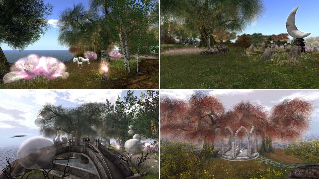 Impressions of Kindred Spirit (1) – aorund the landing point, flowers and unicorns (upper left), the moon sculpture (upper right), the fountain (lower left) and the gazebo (lower right)