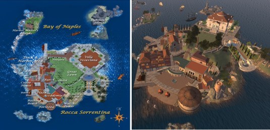 Finally I went to the Information Center where you could spent a lot of time as well getting even more information. I decided to start my visit to Rocca Sorrentina on the ground level. In one of the information notecards, actually in the first from the information board is an orientation map of Rocca Sorrentina and I matched it with a bird eye view. The Harbor Master Island and the Lighthouse Island belong to the neighour sim “Bay of Naples”.