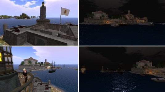 I explored the harbour area and docks along with several shops and the taverna. The shops depict 18th century trades and wares, some of which sell era-appropriate items. There are also SL shops which sell 18th century clothing, home furnishings, and other items appropriate for life on the island. I saw the Shrine of Santa Maria Stella Maris and visited the Anfiteatro, inspired by the Bosco Parassio in Rome, where concerts, plays and poetry readings may be presented. And I went to beach, the fountains “The Cascade”, the Fortezza (a late Renaissance Spanish fortification), the watch tower and the Coffee House.