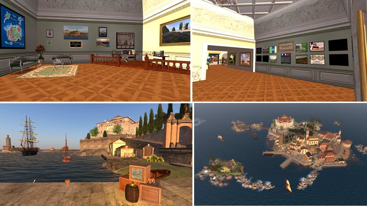 Finally I went to the Information Center where you could spent a lot of time as well getting even more information. I decided to start my visit to Rocca Sorrentina on the ground level. In one of the information notecards, actually in the first from the information board is an orientation map of Rocca Sorrentina and I matched it with a bird eye view. The Harbor Master Island and the Lighthouse Island belong to the neighour sim “Bay of Naples”.