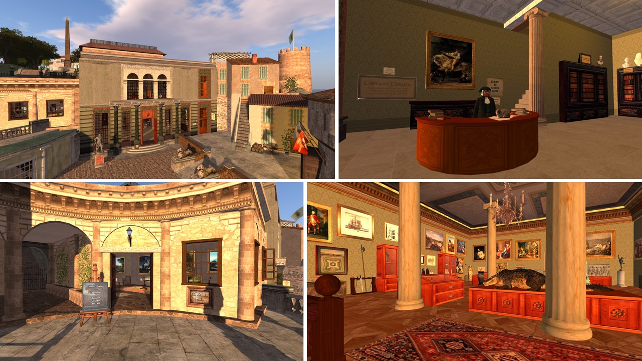I explored the harbour area and docks along with several shops and the taverna. The shops depict 18th century trades and wares, some of which sell era-appropriate items. There are also SL shops which sell 18th century clothing, home furnishings, and other items appropriate for life on the island. I saw the Shrine of Santa Maria Stella Maris and visited the Anfiteatro, inspired by the Bosco Parassio in Rome, where concerts, plays and poetry readings may be presented. And I went to beach, the fountains “The Cascade”, the Fortezza (a late Renaissance Spanish fortification), the watch tower and the Coffee House.
