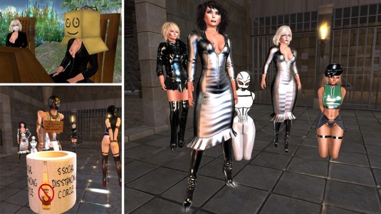 We were interrupted by a restart of our homesim. Those rolling restarts are every Tuesday but usually during the day and not at night. We went down and picked up slave Flo, who was cleaning our house, and took her to Mature Dommes. I took a latex hood with me and I pulled it over slave Flo’s head there. After somme leeway and more freedom during the last 2 weeks it was about time to further thighten the restrictions of our slave as we enter April. That had started already a few days before with adding the armless venus corset.