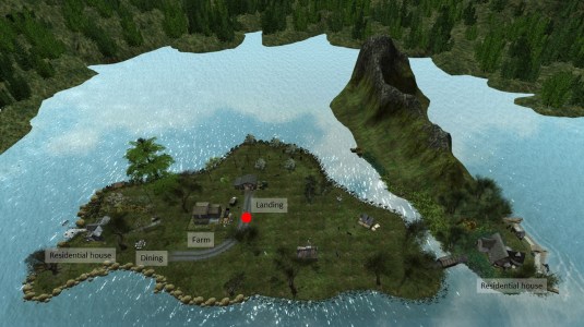 Paradise on Sea consists of two islands, one main island where you land and another island connected by a covered bridge where only a small part is inhabited, the rest is occupied by a big steep mountain. From the bird’s eye view Paradise on Sea looks quite rural and only sparsely pupulated. The landing is direct at the farm in the center of the main island.