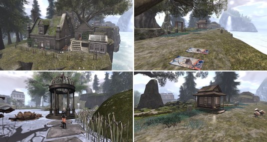 Impressions of Paracosm (2) – Smutsmith’s cottage (upper left) / at the lagoon (lower left) / the Asian garden (upper and lower right)