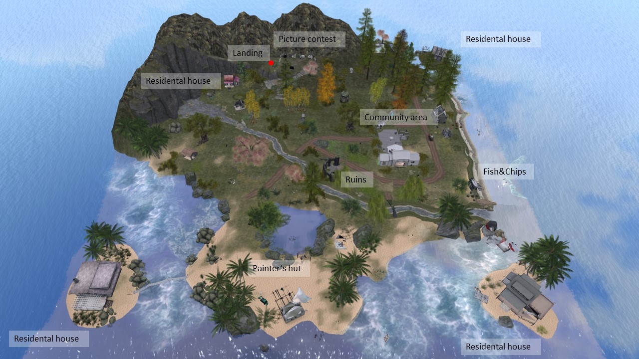 I saw 4 residential houses for rent, three of them are a bit apart from the mainland and hence offer privacy. The rest of the sim is public and provides many lovely spots to sit and cuddle or to take pictures for example at the fish&chips stand or at the painter’s hut on the beach.