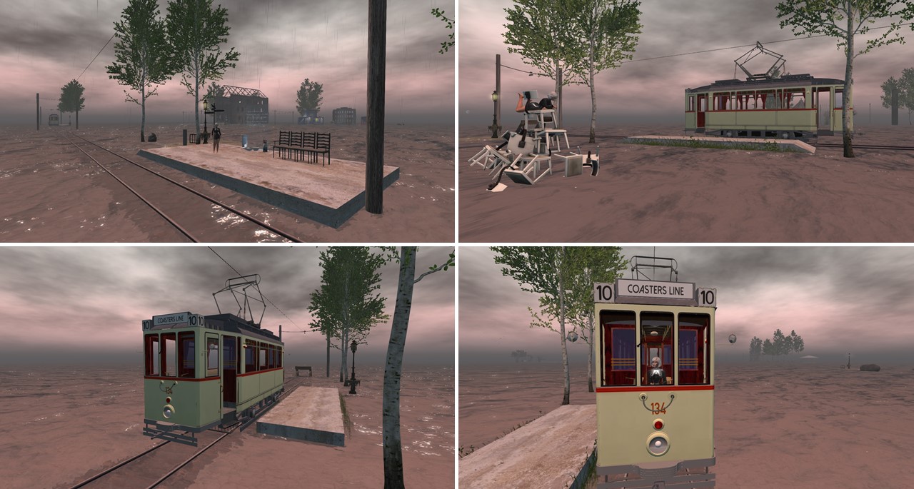 Back to The Coasters Club as I saw it on July 26th. The landing is at a tram station admist the floods. A tram line cuts the sim into 2 halfs. There’re 3 stations, the landing is in the middle. The tram is fully operating – and it looks (intentionally) really surreal in this environment. There are several spots to discover at The Coasters Club right now.