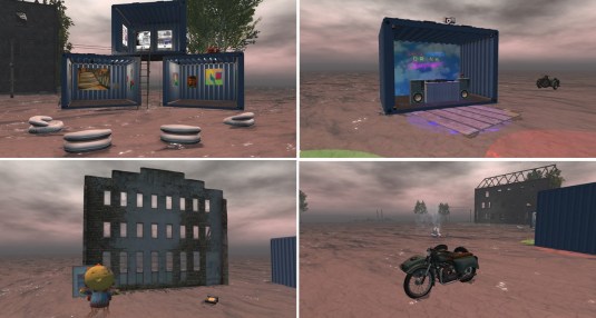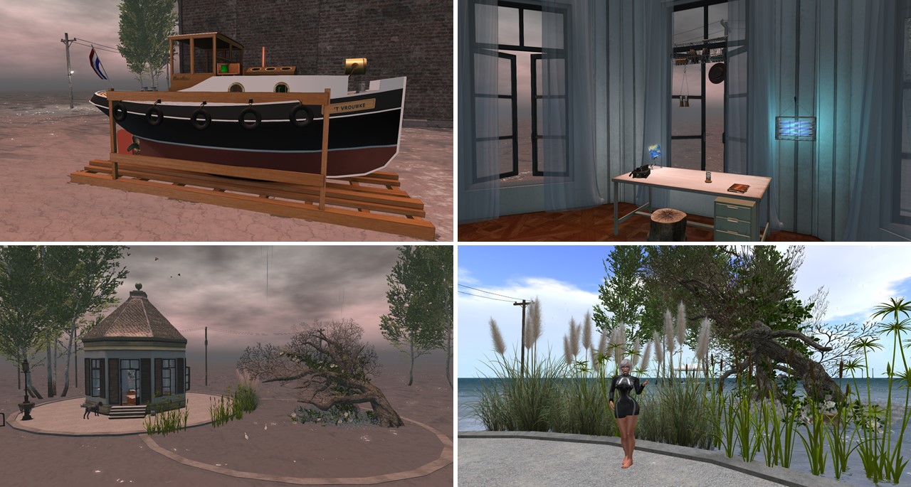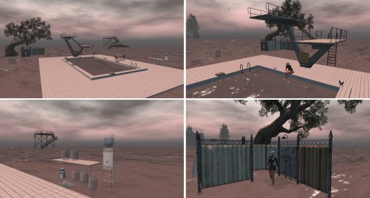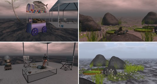 Yeya Zuta writes in her notecard that the sim design (flat and flooded) was inspired by the Netherlands, which lies below sea level in wide parts. Well, you usually don’t get wet feet there, but it is very true that the Netherlands are f l a t. The Coasters Club is intended for exhibiting art objects or smaller installations or to be used as a venue for art performances. If you seek a place for your art that would fit into this environment, you should contact Yeya.