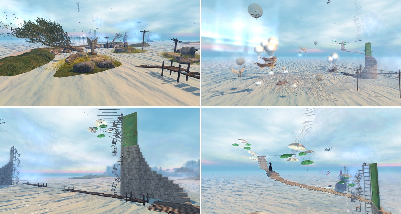 But that is only one part of Eterea. The other part is a bit farer away and surreal. Following some power cable posts that lead into the nothing, you come across some statues and then you immerse into another world. Flying boats, ballons, umbrellas, swarms of birds and three stone stairs leading to doors, leading to paths in the sky, stairs built of stools – just surreal. You can walk on the paths and get new impressions ….
