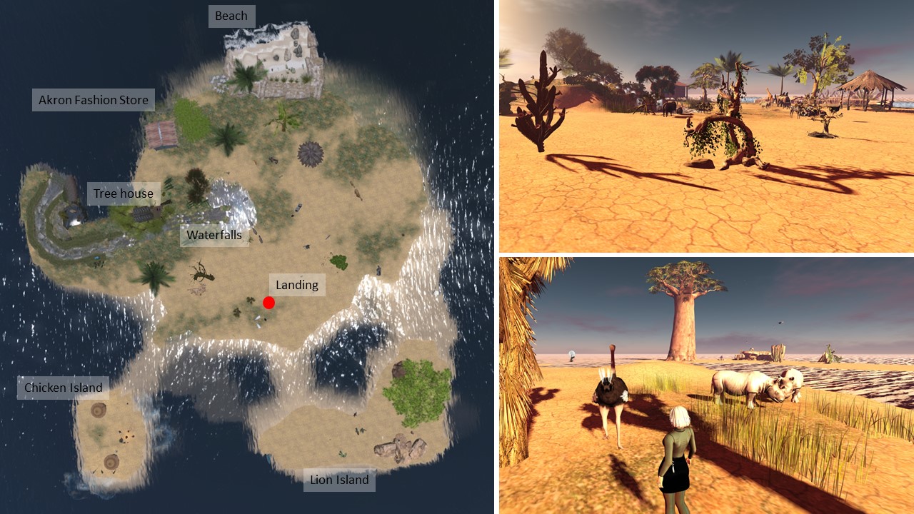 The landing is admist some animals, the ground is dry and sandy, the selected windlight with a clear sky and red tones provides the feeling of heat. As can be seen on the overview picture of Arkon, it is a quite flat island, two smaller islands are located at the shore. Right at the landing point I saw an ostrich and two rhinos.