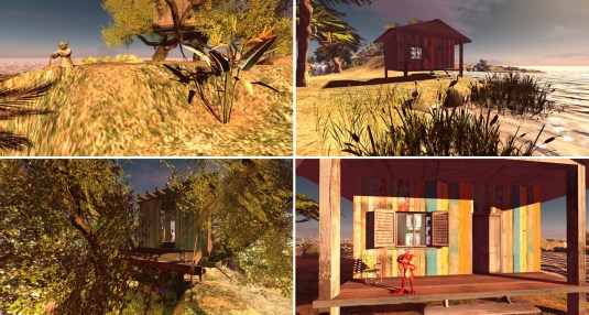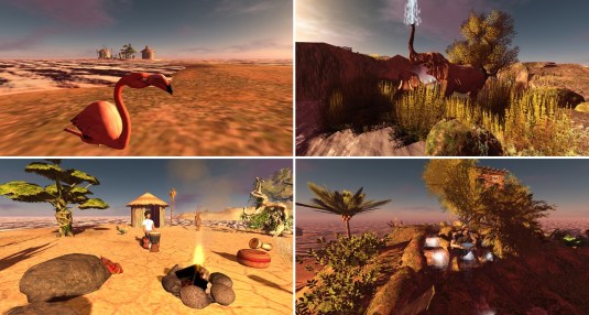 I first went to one of the smaller islands. You get wet feet going there but you can do it on foot as a sandbank connects the island with the main island. There’re two simple single round huts, and an African man sitting at a campfire. I like the use of these static non-player characters (NPCs) as they liven up the secenery. Some chicken run around on the island and you can hear them gaggle. That’s why I named this island “Chicken island” in the overview picture.
