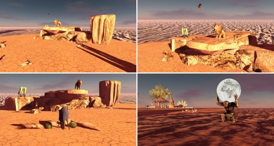 The second island holds a particular suprise – a lion who watches the surrounding from the top of a rock. The Lion moves and roars and tries to catch a vulture that flies around its head. Another NPC livens up the scene, a photographer taking pcitures of the lion – just like I did. If you have a closer look you can also see an hyaena at the foot of the rock. A really amazing scene! at the end of my simploring tour I came across another piece of art at the shores of Arkon – a statue holding the globe on his shoulder.