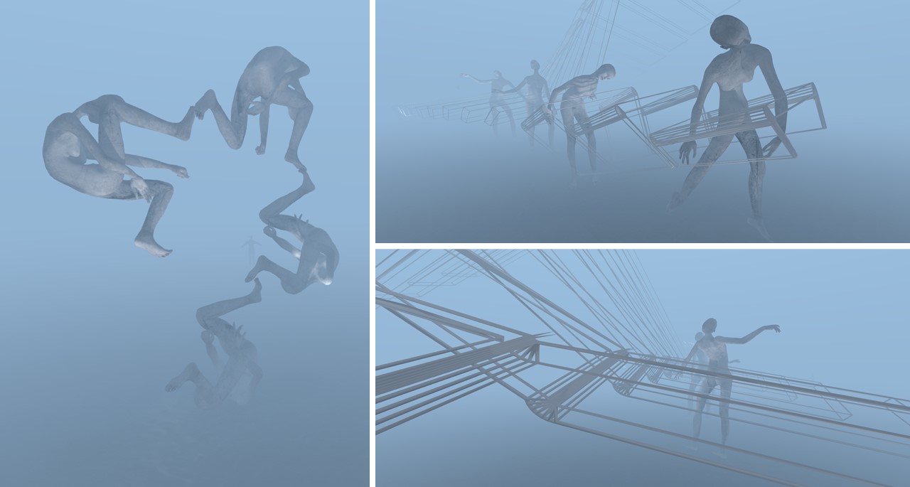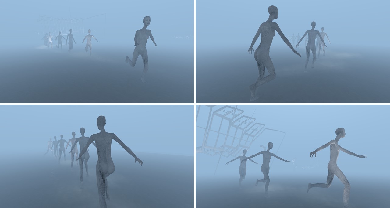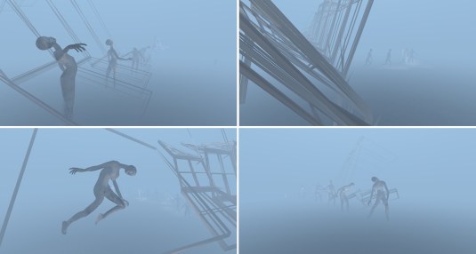 Another group of 4 figures form a circle and hoover in the air. It is silent, no music, no noise, no sound – just you in the foogy, hazy skybox alone with the walking figures with the geometric forms.