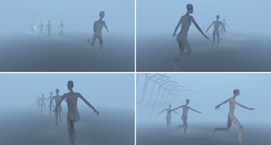 In order to have the full experience you should accept the windlight change and set advanced lighting and schadows on. The installation consists of several geometric structures that appear in the fog and become more and more visible as you approach them. Figures appear … they climb the structures, they melt into the structures. At one structure you see the figures walking in a long line, about 10 of them (I didn’t count). They walk but don’t get anywhere.