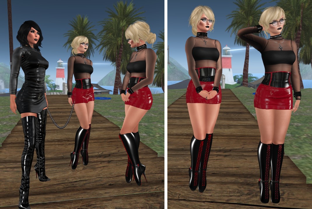 Mistress took me to Mesmerize Dungeon. It was full but I didn’t see anyone because I was quite stirred up and in deep subspace. Mistress played with my poses and put me into a sub pose in addtion. As I had swapped with Angelique a lot the days before, Mistress had the desire that Angelique should dress like me and we both, Mistress and I, talked with her. Soon after Angelique showed up … wow … Mistress with two Angeliques at her leash.