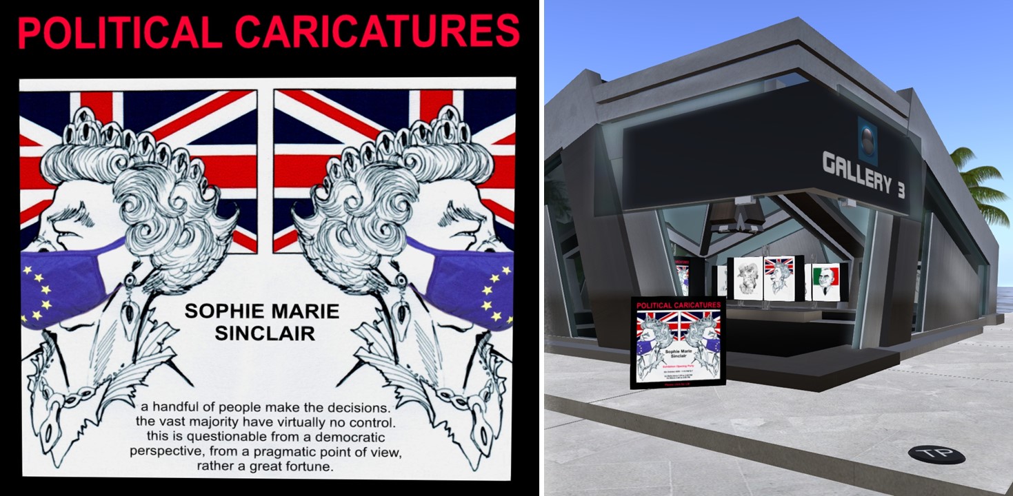 “Sophie Marie Sinclair is a RL painter and book author. She mainly paints nude from models and abstract art. She loves to experiment with different kind of paint and lithography. She has made several book illustrations and was for many years political cartoonist for a well known satire magazine. She lived and worked in the Unites States, Australia, Rome and Monaco.” (taken from the notecard I got at the Extempore Gallery and Lounge)