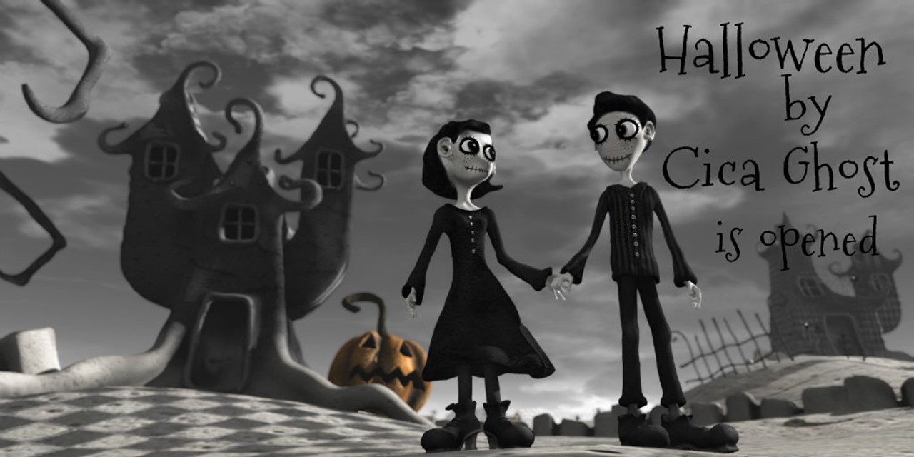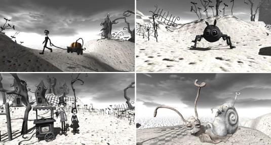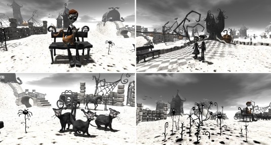 “Halloween by Cica Ghost” is best experienced using the preset windlight and turning on advanced lighting with shadows of sun+projector. The arrival is in a half opened giant snail shell on a hill. You have a quite good view on Cica’s world from there. You see some dead bare trees, spiderwebs, a carriage, some typical “Cica-ish” houses in the background, some flowerbeds with black stems. The world is grey and bleak.
