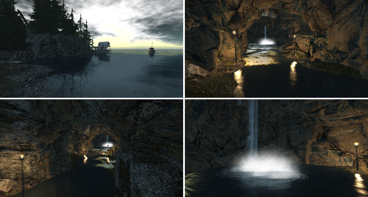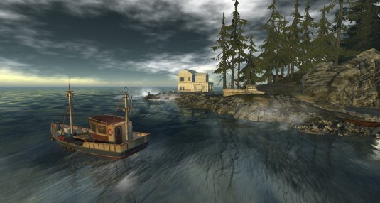 The first views of Ghosts of Jericho are impressive. You land at a fishermen pier. At the end of the pier is a house used for fish processing and to the fishermen to change and take a break from work. Outside you find some rack with drying fish. The view from the pier to the rocky island with its trees and to the neighbour island is breathtaking. Fog is rising from the ground and from the flattened sea. Nearby is a larger waterfall.