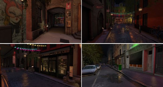 But there’s more to see at Midnight in Paris, not just the Louvre, the Eiffel Tower and the promenade along the river Seine. Behind a Bistro there’s a passage leading to a cul-de-sac road. And that is designed really well, almost perfect. There are so many little details to discover, be it the graffiti at the wall, the different stores, signs, bicycles, garbage tons, a chair, the illumination above the street, etc.