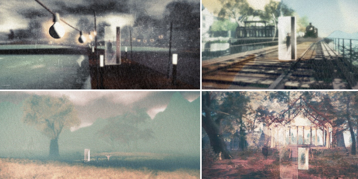 The room is held in cool blue tones. As far as I could tell the raw pictures were taken at Second life. They all a bit blurred and hazy so that the original picture appears dimly. Exploring the pictures tempts the spectator to get deeper into the picture and figure out more details or to add more details from own thoughts. What is common is a door. You find a door of different size in every picture, sometimes you can see a person in the door. That might be the door that allows you to see behind, to get the details, who knows?