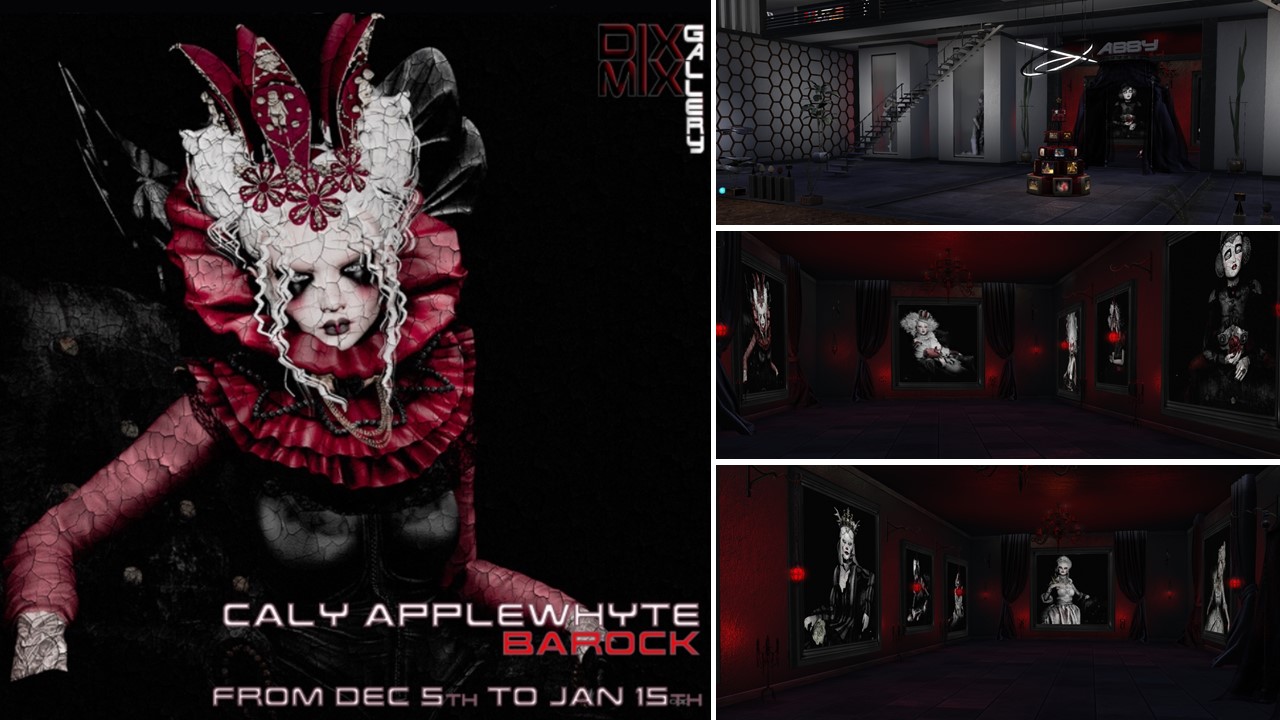 I visited the exhibtion “Barock by Caly Applewhyte” which was opened December 5th at the DixMix Gallery. The theme of Caly (Calypso Applewhyte)’s pictures in the room “Abby” is – surprise – Barock. The room itself is decorated with the luxury colour of this period – red. Dark red curtains at each side of each picture like a curtain being opened to showcase the art. Red lights at the red walls, a dark floor.