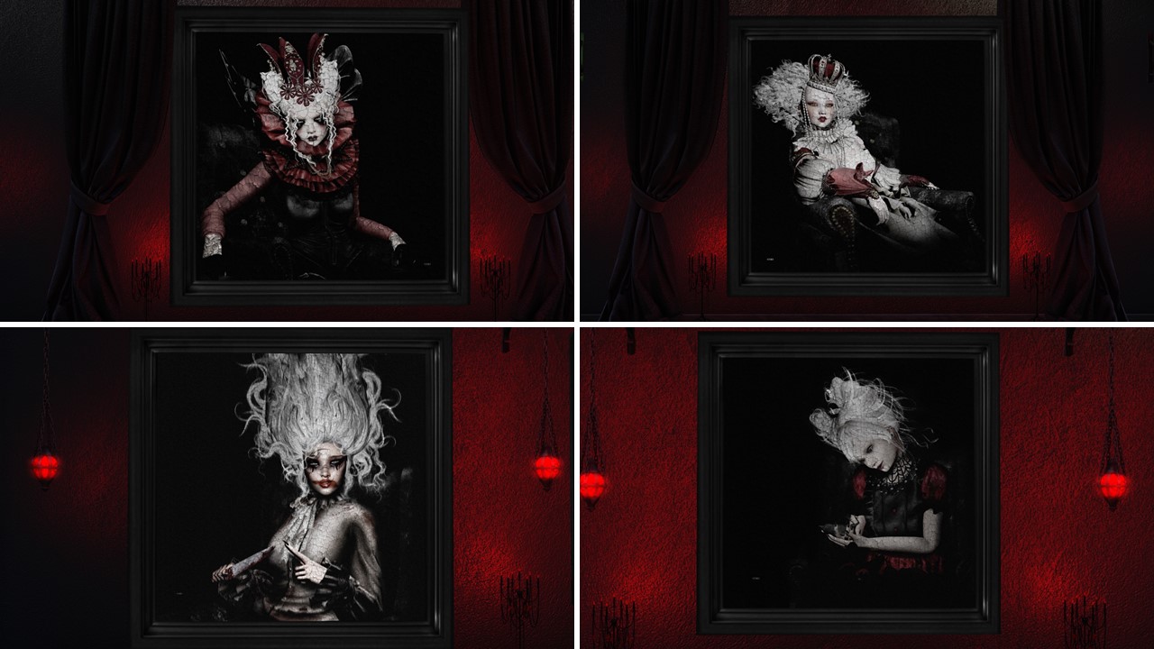 The pictures itself presents avatars, fantasy persons, not necessarily from that era, but with wild hairstyles and often colourful make-up. But they all are dressed according to Barock. And the paint has already become brittle like it does on old paintings. This combination is intriguing and invites to take a closer look to decide which effect is dominating in this or that painting.