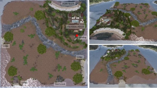 As seen on the orientation map, the Kidaka Resort Hotel is the main building on the sim. Besides this building there are some lodges/houses mostly located at the coast or beach. You can rent these lodges from 100L – 300L per day.