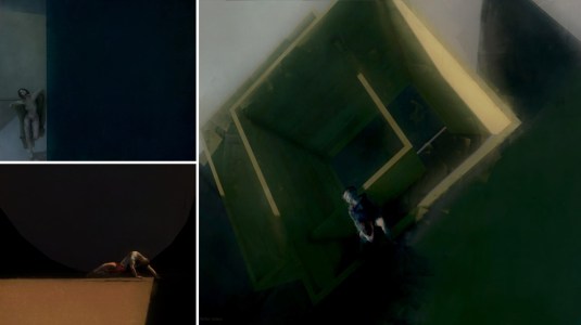 Actually the figures are comparable small in comparison to the form. Habour uses both, females and males, and instinctively the view of the spectator is focused on the figure, trying to see more details, like clothes, shape and age. The form doesn’t prevent focusing on the figure as it is kept simple. The forms itself would be nice abstract art with the light effects and selected forms and colours, the figures itself would be to small with no particular feature – but together they interact.