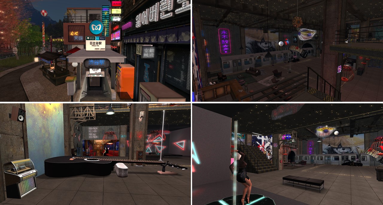 The landing is at a spot where you can either walk into the magic forest or into town. I started my visit with the town. Just after a few meters I saw the entrance to the subway. I expected to see some stores and a subway station – but no, it is the entrance to a huge night and dance club, which alone would be worth a visit. I like the huge gitarre and the all the other decorations. There’s pole dancing as well as enough room to sit and to dance. A very well made club.