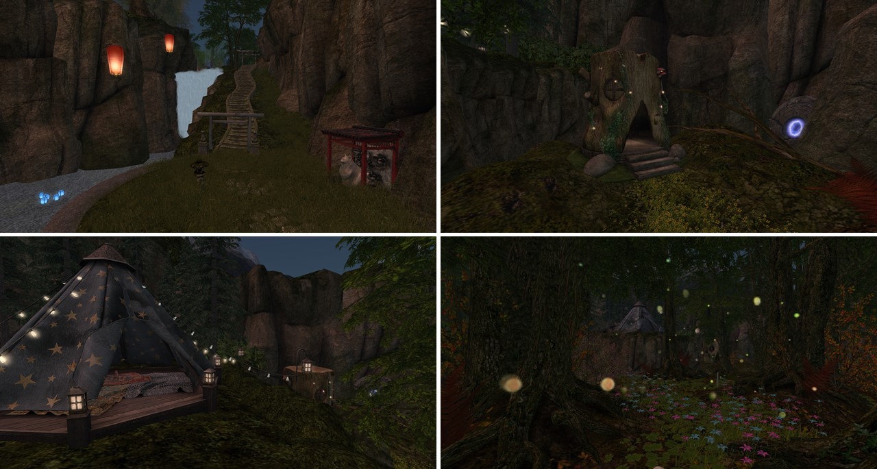 If you walk from the landing point not into town but over the bridge, over the river you enter a complete different world. A long stairway leads into the forest, which I called magic forest because of all the lights and laterns. There are quite a lot places to sit and mediate, places to enjoy the nature and the magic, places to spend time with a loved one either under a tent or in an hallow stump. Again, I’m pretty sure that I missed many details.