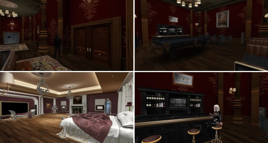 The headquarter fits perfectly with The Inshan Group. You will notice that it is built thoughtfully and with love for the detail. It is an urban setting. The landing point is on a street, for sure not the best district of the town – and it is raining. The concept is technically quite interesting. The entrance doors of the buildings are teleporters which bring you inside. And the inside doors are also teleporters which bring you into separate rooms. Each room is in a separate skybox. This way you have quite some privacy in every room – and privacy is important for the Mafia business, isn’t it? There is a brothel with a main and a VIP entrance round the back, a warehouse to store victims, several offices, a so-called orgy room, a bar, a dungeon and some more private rooms.