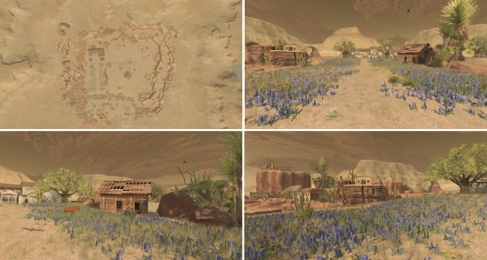 The air is filled with dust, the sky looks orange and with the red rocks at least I began to sweat just by looking on the screen. The first view I got was the way ending at the Hacienda La Veleta, blue blooming flowers at each side. Looking around some pueblos built into and onto the red rocks caught my eyes (actually they are off sim). And I saw some cactuses and a horse.