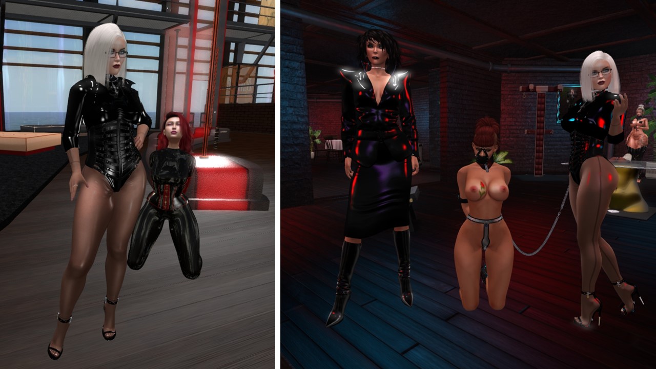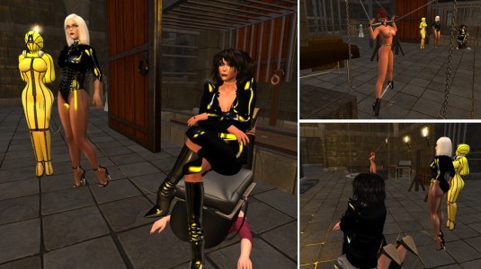 At night Mistress Jenny and I played a skipee with Flo first and caught up with our mutual news while we were playing. After the game we went to Psi’s realm with Flo. It was nicely crowded at Psi’s and there was some mainchat going on too. slave Holly showed up inworld while we were at Psi’s realm and of course we teased her. Gina (Gina Lytham) approached us, praising Flo’s strict suit. She seemed to be eager to swap places with Flo (or slave Holly?) but of course she denied it. Without further ado I took advantage of her accessible open collar and made her a seat for Mistress Jenny, who was happy to sit down after a long day.
