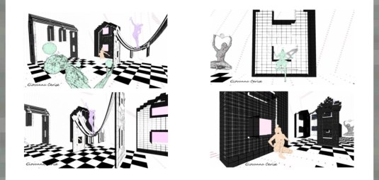 Giovanna Cerise used her space at La Maison d’Aneli to showcase her “Doll’s house”. It is a space main held in black and white with clear structures that is partly in 3D and party in 2D (but looks 3D). The space has several houses, more a Doll’s village. And there are dolls, I’d rather say ballerinas or dancers. The dolls are stylised, performing alone or as couples in front of the houses or on the open space. There’s quite some to discover viewing at Giovanna Cerise’s installation from different viewing angles.