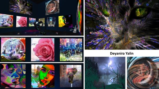 Deyanira Yalin’s skybox at La Maison d’Aneli is a dark blue box with a 3D object in the center. Her pictures glow colourful in this environment. They range from animal faces over geometric forms, from portraits to flowers. Deyanira often uses different layers in her pictures so that you have to immerse into her art.