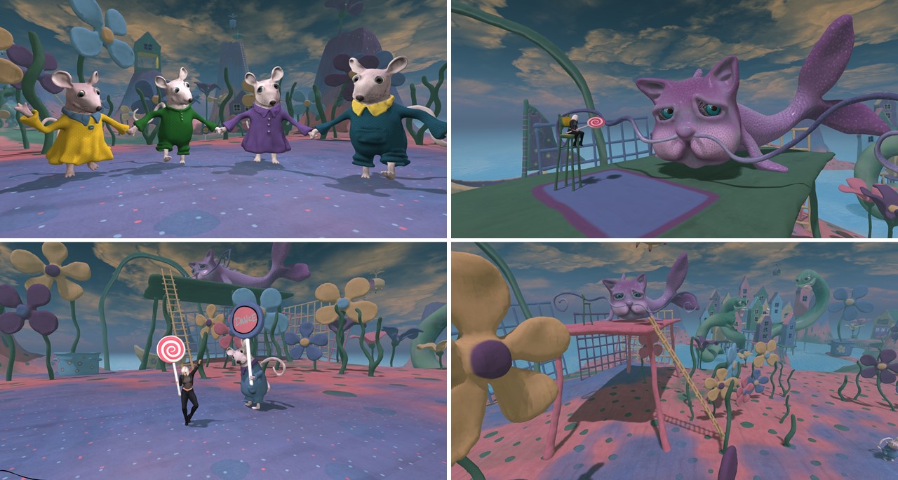 Aus usual you should use shared environment and set advance lighting on as well as shadows from sun+moon and projectors. The fun begins right next to the landing spot where I met Cica. In front of you is a large court with 5 funny mice. One of them holds up a sign “Dance”. Hence you can start dancing to get into the right mood.