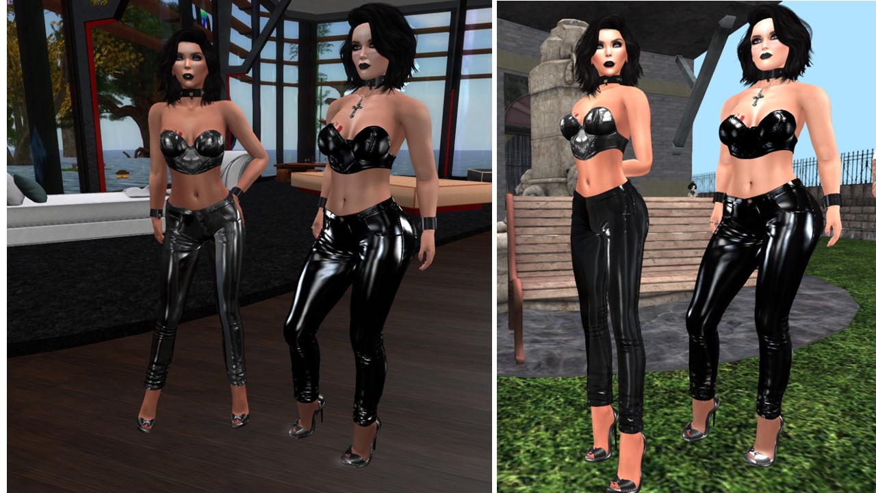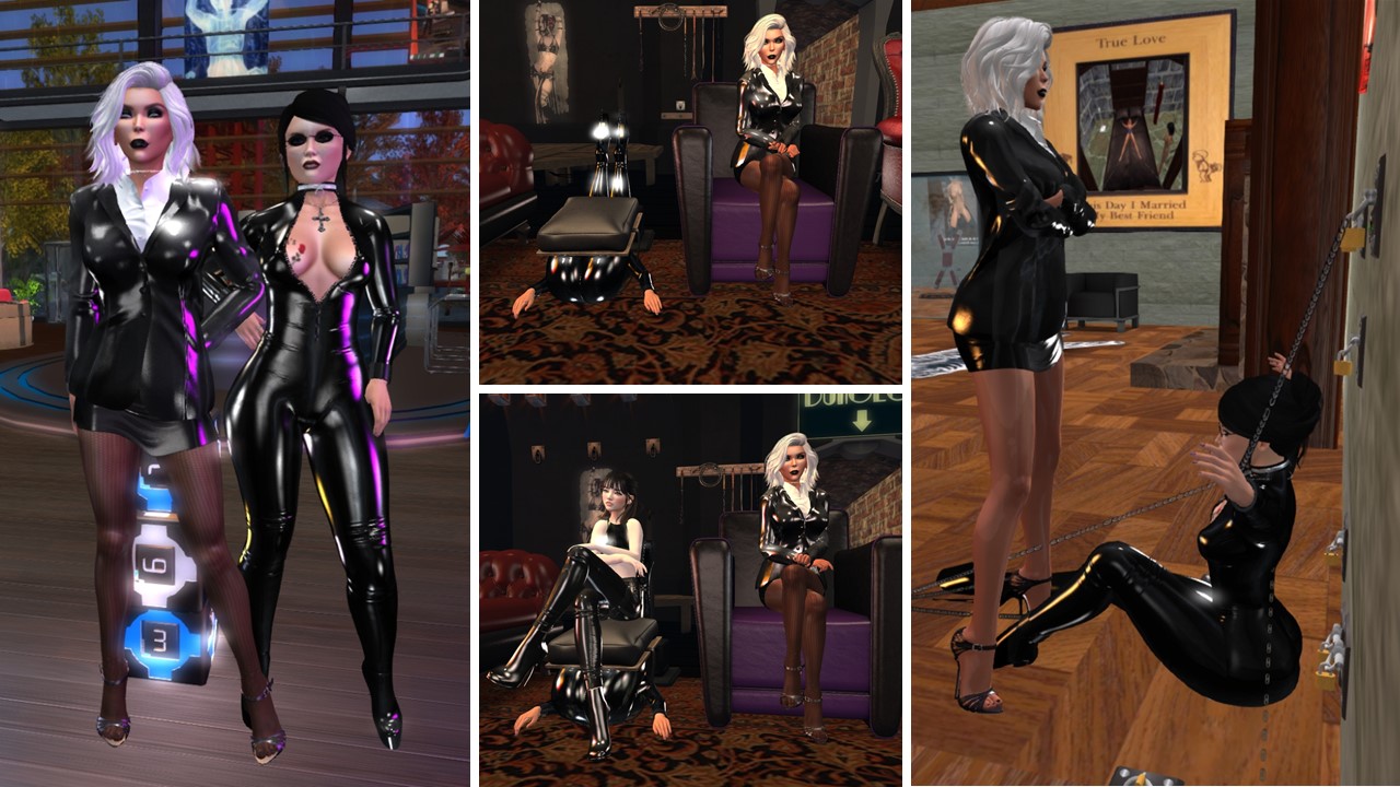 When I returned inworld in the early afternoon, Mistress Jenny was already present. She unlocked me and led me to her throne to get licked by me. I licked her with passion and desire and got the next does of her intoxinating sweet poison falling deeper into submission to her. But this time Mistress had different plans. We went to xtra Ordinairy and I got the same latex business dress that Mistress was wearing since the day before. Furtheron Mistress took me to the hairstylist … and soon we were twins. Mistress even unlocked my slave collar and exchanged it with my partnering collar.
