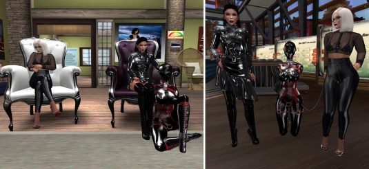 We had another family night. When we came inworld our latex doll Sun was present and we took her to Psi’s ralm to decorate us. When Flo came inworld we returned home for a skippe and when we finised playing, Alessi and slave Holly had joined us. We returned to Psi’S realm. It was full and a lot was going on, hence we had good eye candy and entertainment. I leashed our latex doll at the chains when she had to leave for bed. She will stay at Psi’s overnight. Mistress Jenny and I had comfortable first row seats and a glass of wine while watching what was going on.