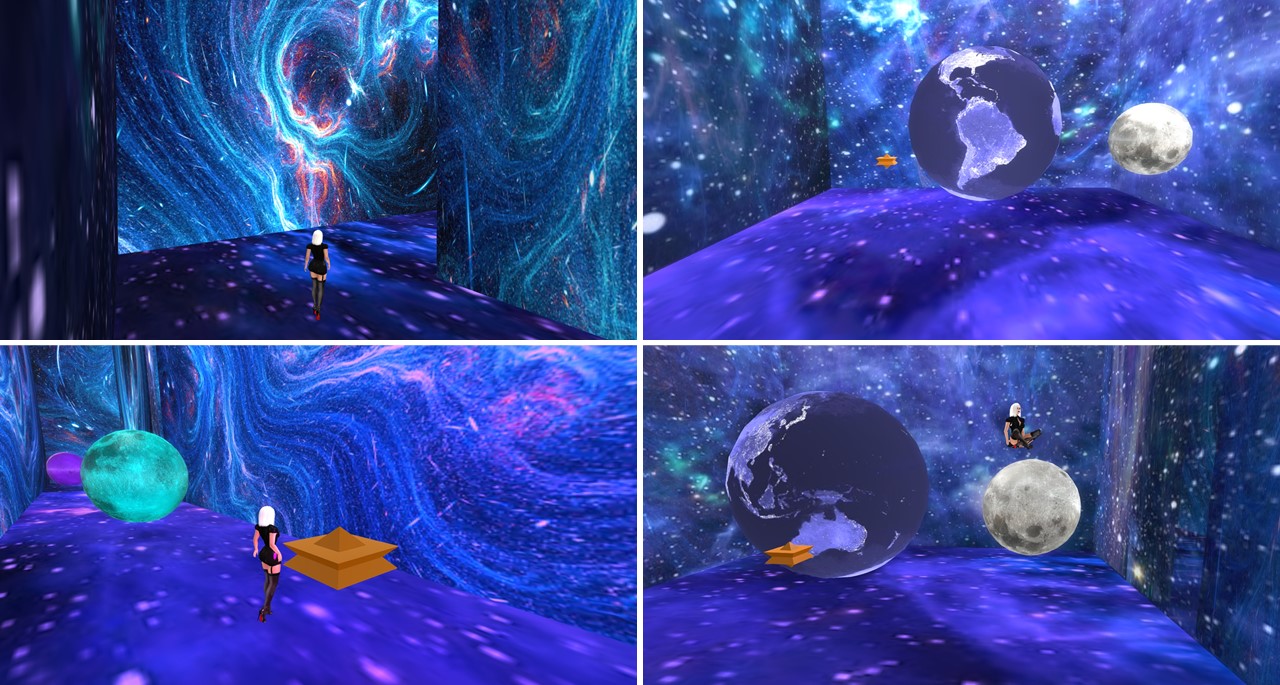 The spaceship stands for the space, the eye for the mind, the bug for the earth and the cube for the tecno maze. I started on the left and visited the Space maze first. Inside the maze you can get easily lost. The textures on the walls of the maze are permanently changing, sphere, coloured spheres like planets block your way as you try to find the center of the maze. In the center you find our planet Earth with it’s moon. You can “sit” on the moon and mediate. And you find a box with a gift giver. I won’t reveal what you get and won’t spoil your fun.