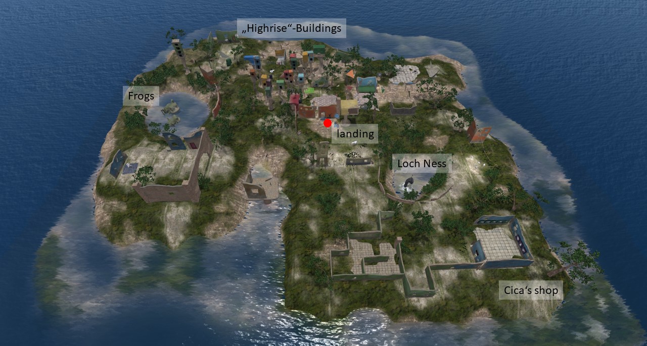 As I usually do, I zoomed out first and choose Midday as enviroment to get an overview. The landing is right in the middle of the sim. You can easily spot Cica’s shop for this installation, 2 ponds and a group of higher Cica-ish buildings, which I called Highrise-buildings. After this zoom out I used the shared environment settings again (as recommended).
