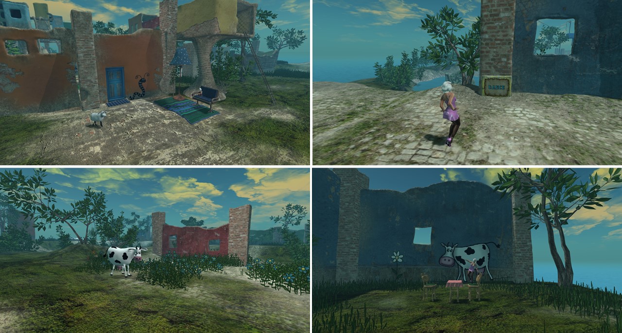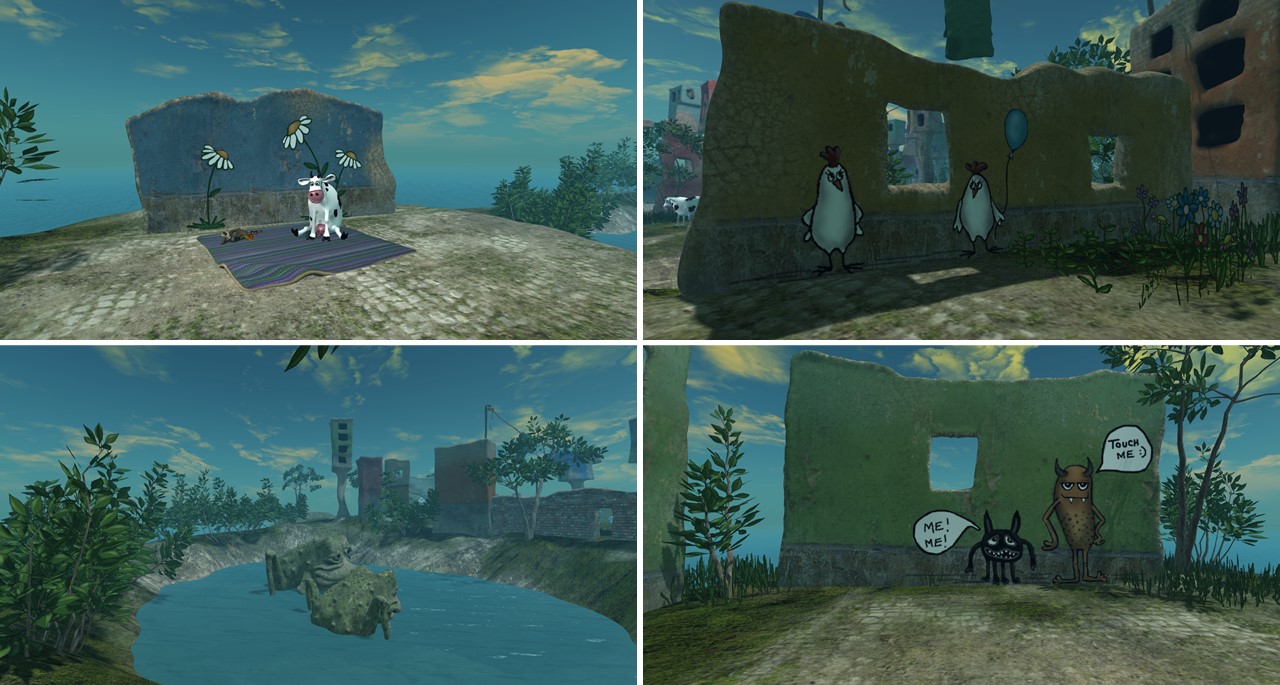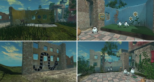 The paintings are mostly simply funny. For example the chicken that is jealous of the another chicken which holds a balloon. Or the two monsters that fight to be touched by you. If you touch them you get a link to Cica’s store on the marketplace where you can buy the little monsters that are from a previous isntallation of Cica Ghost. Also the frogs, which take a bath in one of the two ponds, are from a previous installation of Cica. Hence you can meet old acquaintances at Funday.