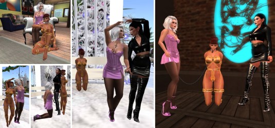 We went to Puerto Esclava where I knelt by Mistress feet while she was talking with a dom, who made compliments to her and how she educated her slave (me *winks*). We went to Heavy Bondage Club, where Mistress saw a woman wearing nice pencil skirt from one of our favourite stores and we went shopping next. Mistress got the skirt from me as a New Year gift – and I got a dress (to be worn in green, pink and purple) from her. Our last stop was club DeLust where I changed into me new dress. Mistress loves me in pink. We had a lovely time together, just the right thing to do at the end of a year that was quite a challenge for all of us in our RL.