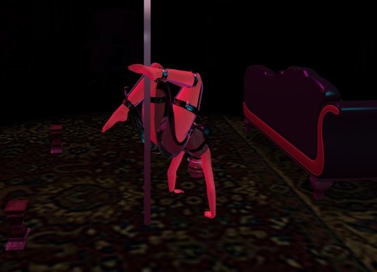 My evening wasn’t yet over…. Mistresses retired the dungeon where I took my place on the dance pole and danced for Mistress Jenny and Mistress Diomita as they watched from close by, yet out of sight. ‘Dancing in the Dark’.