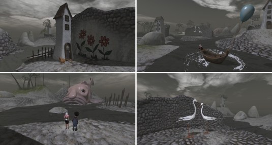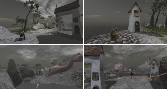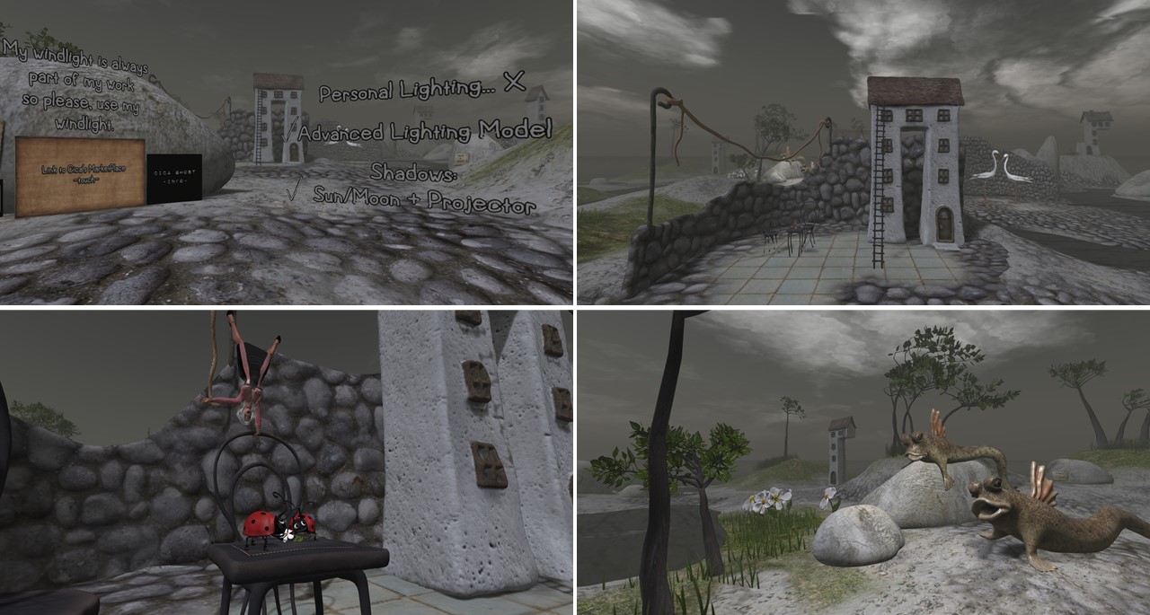 To say it right away “Make a wish” by Cica Ghost did conjure a smile in my face from the very beginning of my visit. The island Cica designed is quite meager but there are some fertile corners where you find single trees and daisies – the kind of “Cica-daisies” which I planted also at our homesim. You see some single buildings spread over the island, quite high buildings in the typical “Cica”-style. There are several ropes stretched between trees, poles and buildings. And Cica hid many animations, be it on these ropes or on roofs, be it on chairs and benches or be it dancing animations (look for the sign “Dance”).