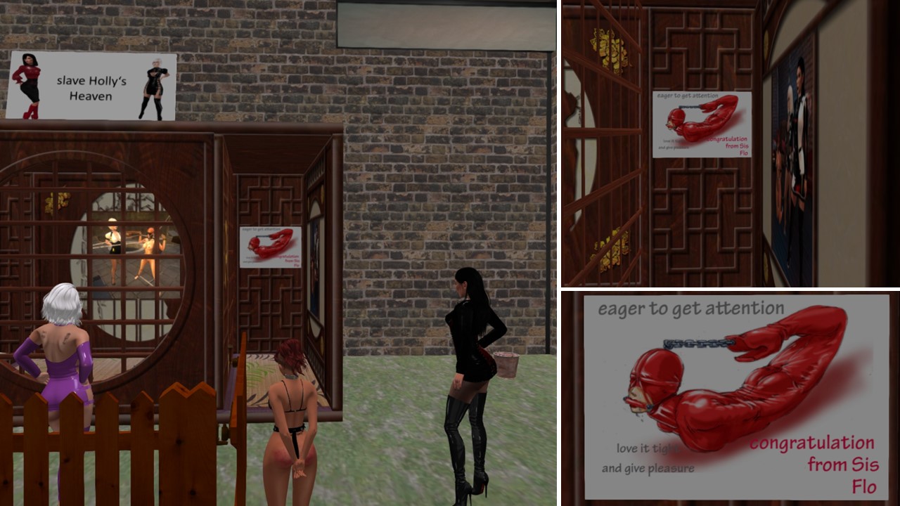 Flo came inworld but didn’t want to join us. She was busy at home installing her collaring day gift for slave Holly. She had troubles as she was trying to hang a picture in Holly’s room … and the door closed again and again locking her inside. I had to come and to rescue her. Finally we all returned home and looked at Flo’s present – very thoughtful!!