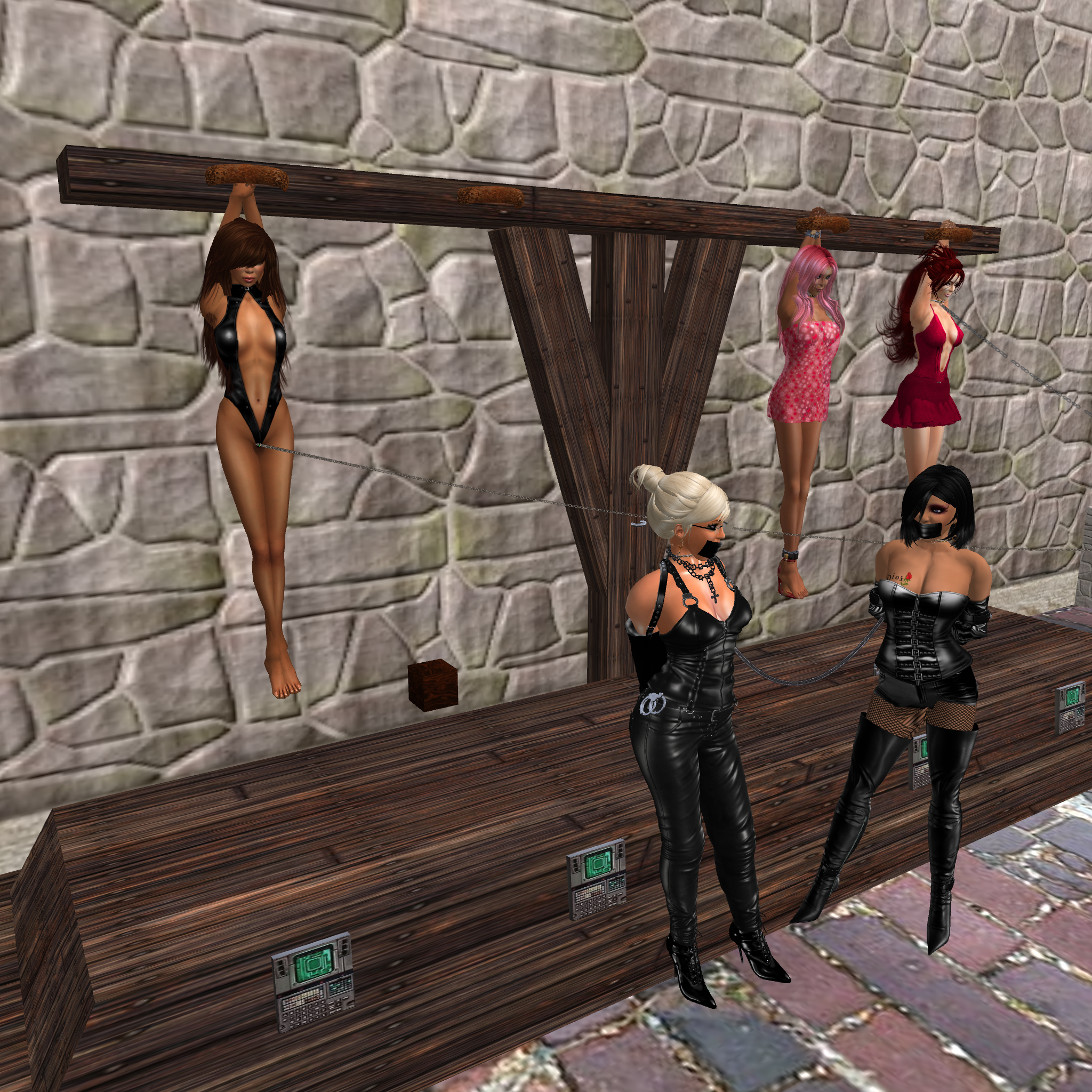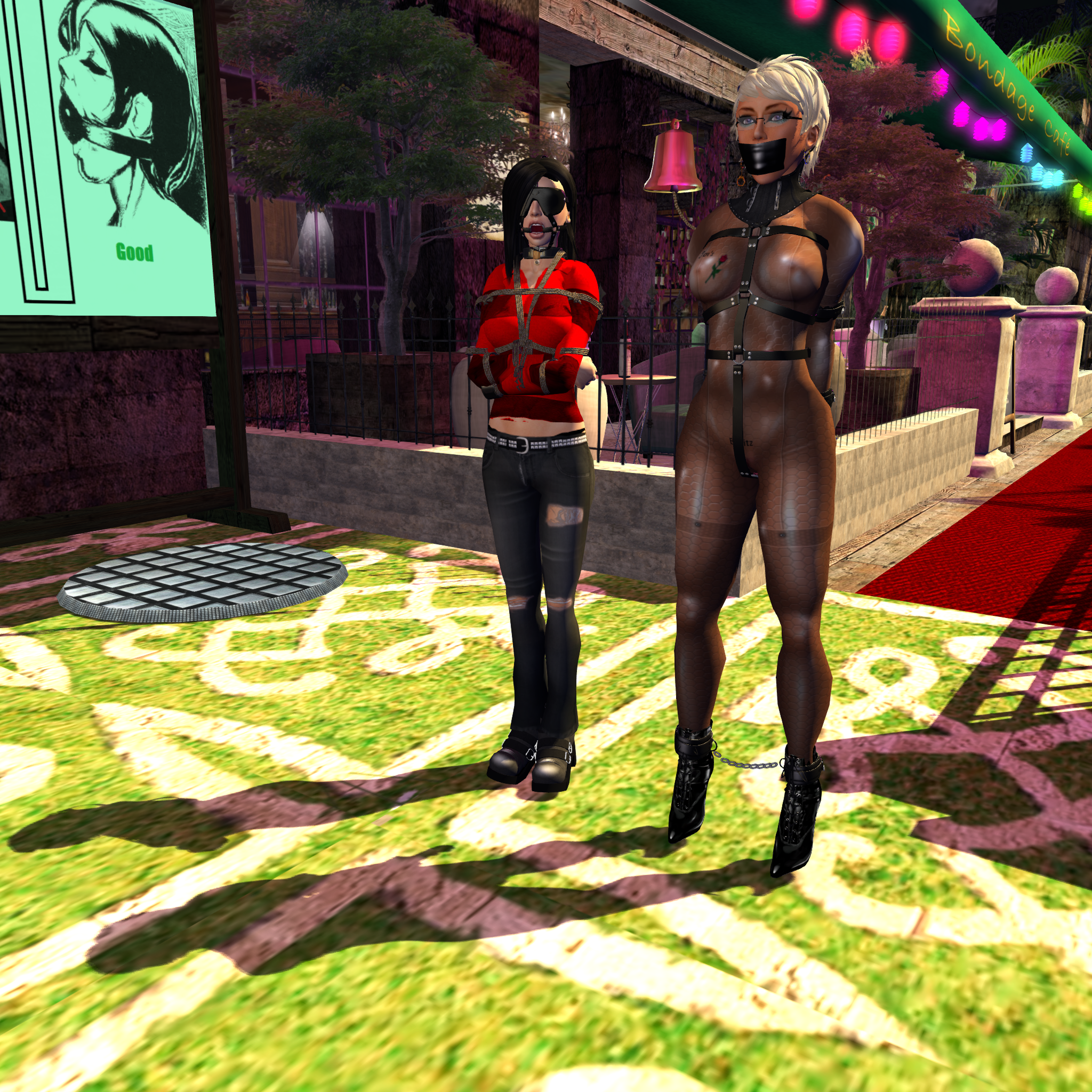 Then we went to “Grannus”, another bondage playground. We happened to find a domme playing with her subs, who she displayed there at a rack. Funny, they didn’t feel disturbed by us. We stood in front of the rack just watching the scene. Then Argi sent an instant message to say hello and we asked her to help us out, to rescue us and after a while she finally agreed. Of course she didn’t know what she had to expect and was surprised to see us both tied up and gagged and the poor subs hanging tied up behind us. She didn’t tell us directly but I suspect that she’d love to swap with us and was secretly envious.
