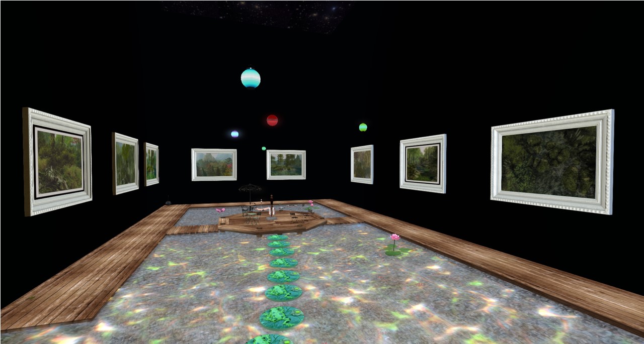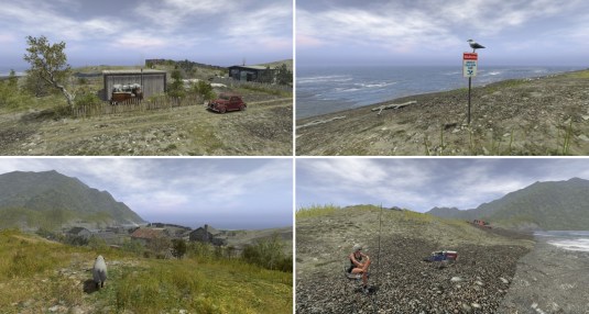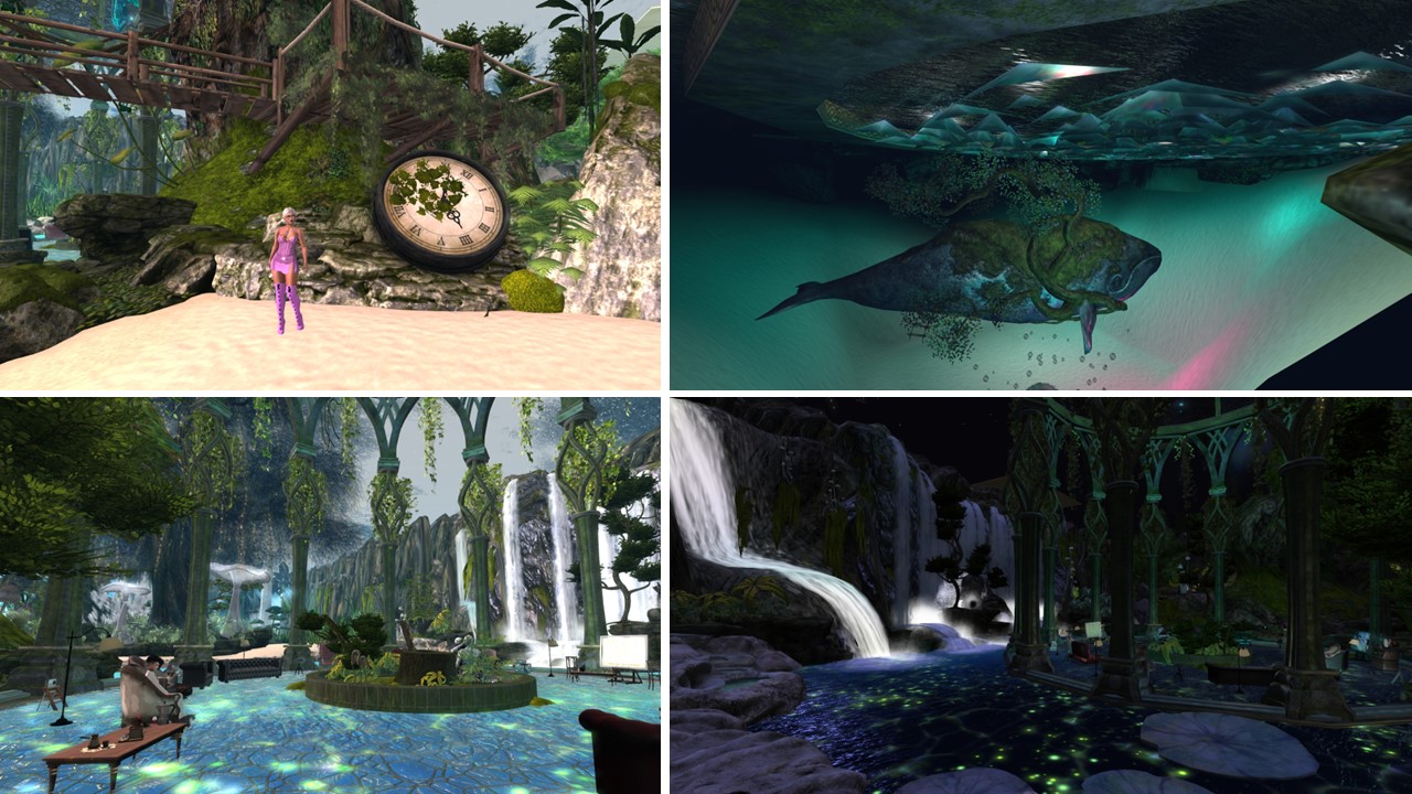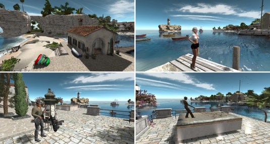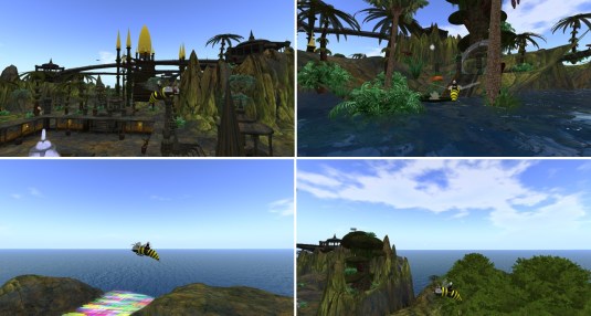 I returned the the landing point and went into the other direction and up the hill at the end of the road. There is a landmark. A robot made of scrap parts. It seemingly guards the sim and seems to be a good fellow. From the hill you see down to a wooden path and there’s a cosy spot to watch the fish and seagulls.