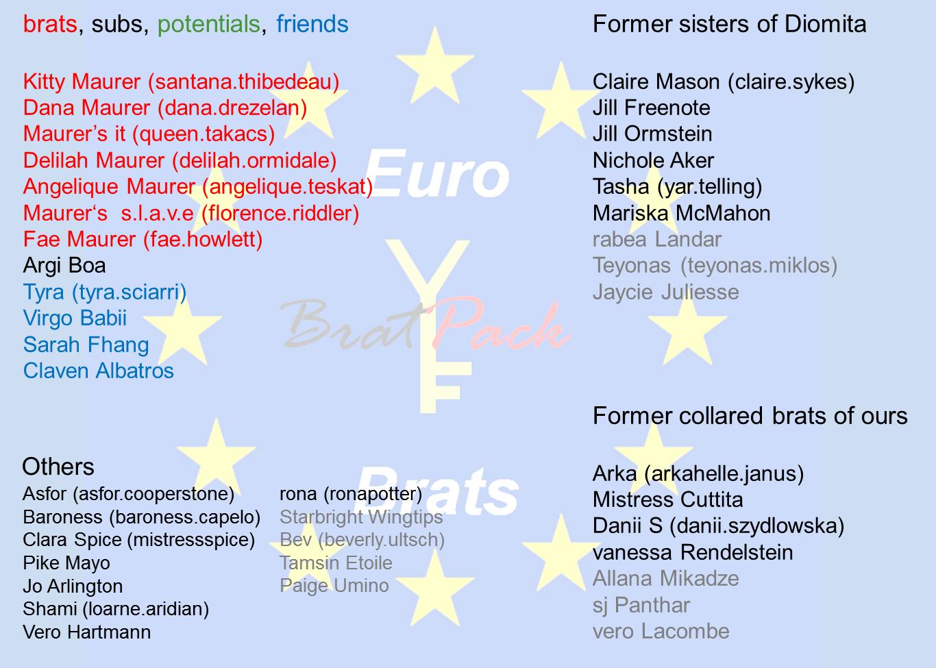 Let me start with the name and the logo of our group. It is called “Euro Brat Pack”. Ok, it is quite obvious that I’m European as is my wife, partner, slave and owner Jenny (laylady.lay). So that explains the “Euro”. When I founded the group I was collared by Yasmin Heartsdale, who coined my Seconed life during my first years inworld and who owned me for more than 3 years as her sub, her brat. Her family was called “Yasmin’s Brat Pack”. Yasmin is from the US and I saw her not as much as I wanted to which is one reason why I was quite independant although I was owned. Quite soon after my collaring I collared Jenny and began to build my own family, first within Yasmin’s family. I founded the group and looked for a logo. I seleceted the European flag and added the symbol of Yasmin’s Brat Pack into the middle of the stars. Done.