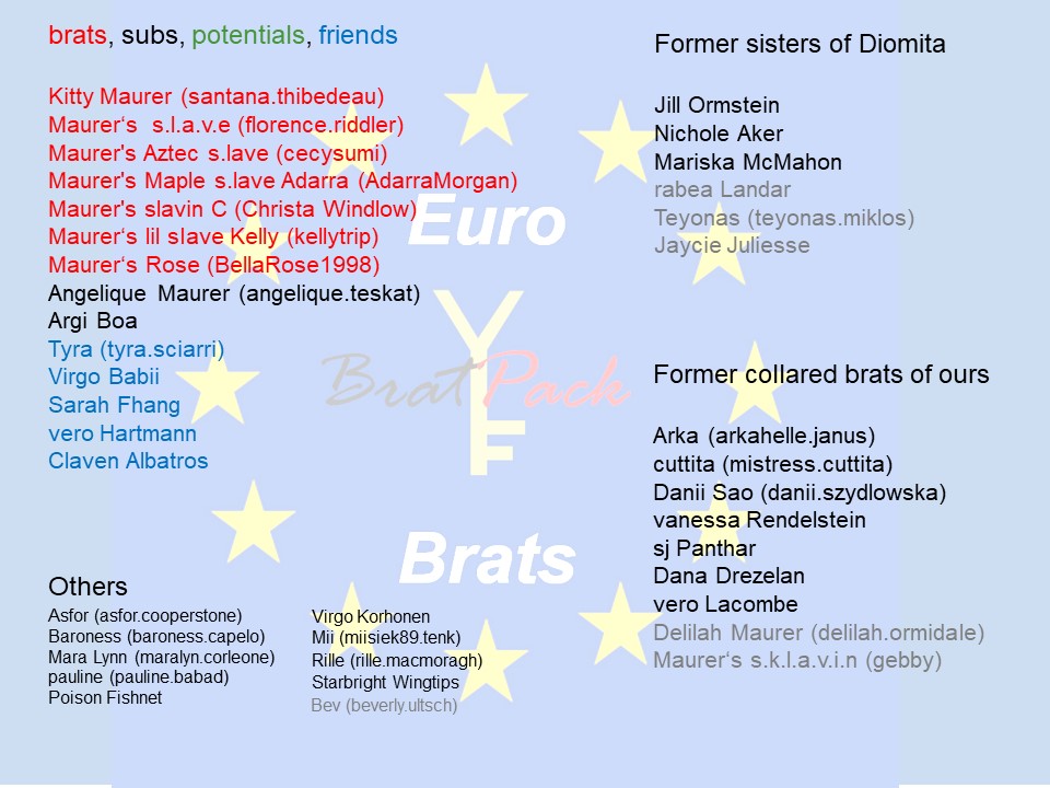 Let me start with the name and the logo of our group. It is called “Euro Brat Pack”. Ok, it is quite obvious that I’m European as is my wife, partner, former slave, Mistress and owner Jenny (laylady.lay). So that explains the “Euro”. When I founded the group I was collared by Yasmin Heartsdale, who coined my Seconed life during my first years inworld and who owned me for more than 3 years as her sub, her brat. Her family was called “Yasmin’s Brat Pack”. Yasmin is from the US and I saw her not as much as I wanted to which is one reason why I was quite independant although I was owned. Quite soon after my collaring I collared Jenny and began to build my own family, first within Yasmin’s family. I founded the group and looked for a logo. I seleceted the European flag and added the symbol of Yasmin’s Brat Pack into the middle of the stars. Done.